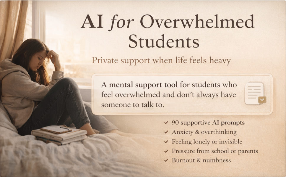 You’ll get: a mental support tool for students who feel overwhelmed and don’t always have someone to talk to. 90 gentle AI prompts to help with anxiety, pressure, loneliness, burnout, and self-doubt — without judgment or pressure.