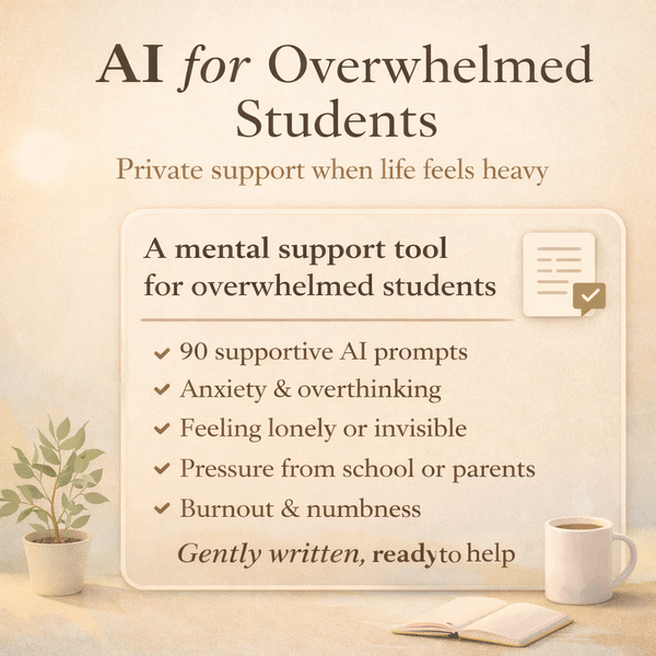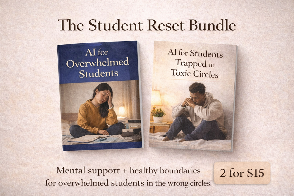 You’ll get instant access to a mental and emotional support bundle for students who feel overwhelmed or stuck in toxic circles. Includes 180 supportive prompts to help with anxiety, loneliness, pressure, boundaries, self-respect, and choosing healthier relationships — without guilt, pressure, or hustle culture.